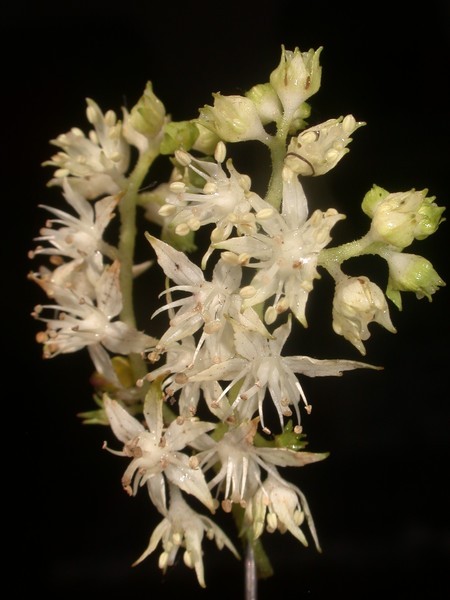 - drobné, oboupohlavné, haplochlamydeické, pětičetné až sedmičetné s úzce vejčitými, mléčně bílými sepaly, diplostemonické s polospodními semeníky