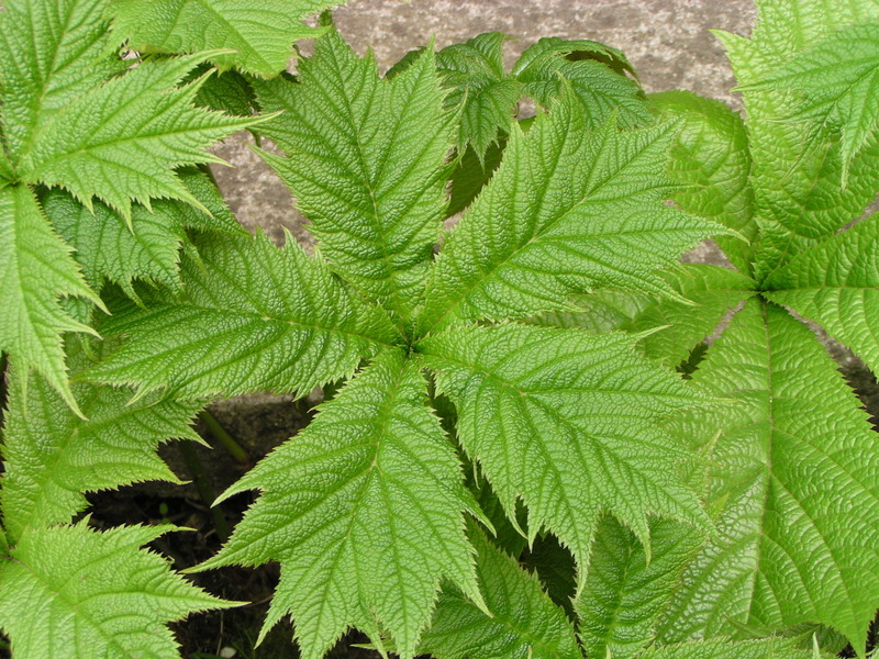 - robustní, dlanitodílné, na pochvatých pýřitých řapících 0.4 - 0.8 m dlouhých, s 5-7 obvejčtými, přes 0.2 m dlouhými, lysými, svrchu hrotnatě laločnatými, pilovitými lístečky