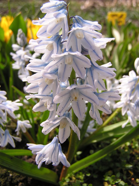 - Květy zvonkovitého tvaru mají bílou barvu a výrazný modrý proužek uprostřed květních plátků.