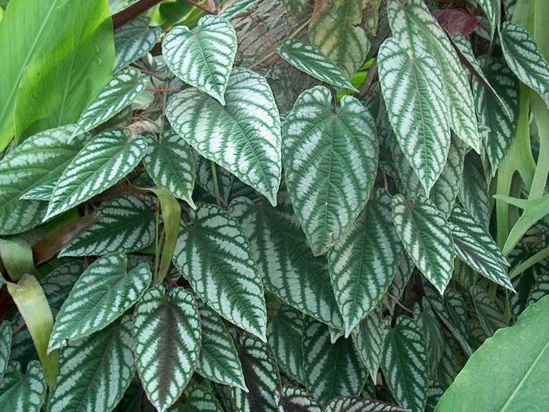 - střídavé; kopinaté, 15 x 8 cm, s výrazně srdčitou bází, dlouze špičaté, sametové, fialově purpurové se stříbřitě šedým mramorováním; středový pruh olivově zelený, rub listu purpurově červený