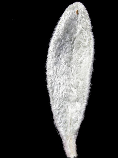 - elipčitě kopinaté,cca 0.1 m dlouhé, v růžici řapíkaté, k řapíku sbíhavé, hustě hedvábitě vlnaté, často zdánlivě celokrajné (pod hustým oděním s okraji jemně vroubkovanými)