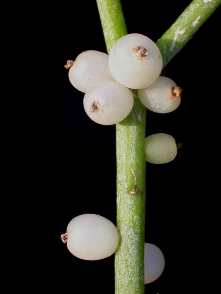 okrouhlé, průsvitně bílé nebo růžově naběhlé bobule velikosti hrachu, s lepkavou slizovitou dužninou