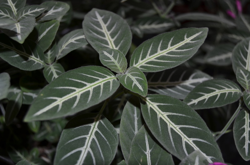 - vstřícné; vejčité až dlouze eliptické, 5-8 x 2-3,5 cm,líc olivově zelený až nafialovělý se stříbrně prokreslenou hlavní žilkou na listu; rub tmavě fialový;