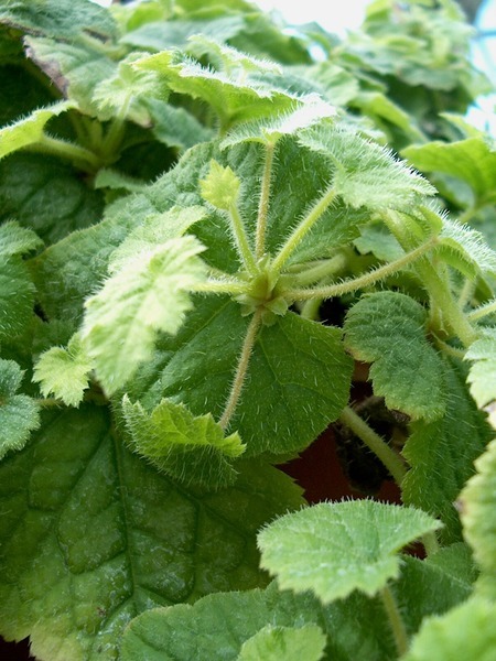 - v přízemní růžici; dlouze řapíkaté, vejčité listy s 5 - 7mi laločnatými okraji, 7-12 x 6-10 cm, srdčitá báze, okraj 2x pilovitý; vytváří nové dceřinné růžice i s kořínky (ztv. viviparia) v místě nasazení listového řapíku na čepel; celá rostlina jemně chlupatě pýřitá