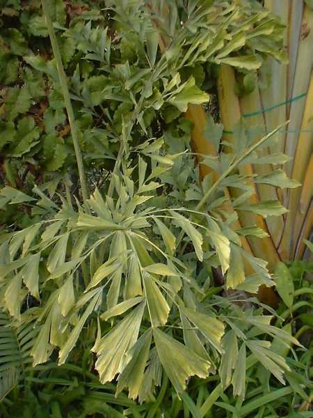 - 2x sudozpeřené, listy asi 2-4 m dlouhé, trojúhlé, na řapících asi 1 m dlouhých; úkrojky ve tvaru rybích ploutví nebo ocasu, lístky asi 15 cm dlouhé, obdeltoidní, s rozeklanými konci