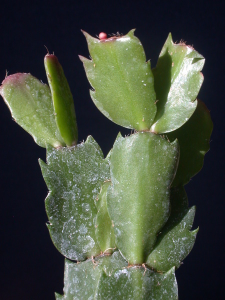 - ploché, článkovan, sytě až temně zelené, na slunci často červeně naběhlé, ostře zubaté nebo vroubkované s apikálními areolami