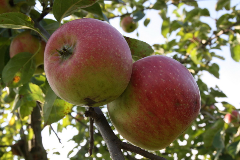 velké, ploše kulovité, slupka je kryta krásnou živou pruhovanou červení s typickými bělavými tečkami, dužnina nažloutlá, zrnitá, chuti sladce nakyslé, velmi dobré