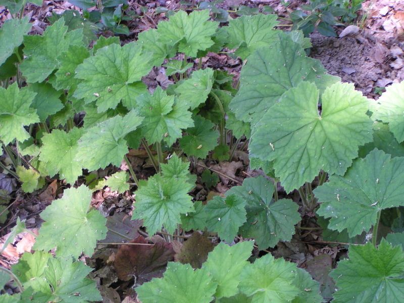 - vyrůstají v růžici, jsou dlouze řapíkaté, v obrysu okrouhlé, 5–9 laločnaté, velké až kolem 15–20 cm, zelené se šedavým nádechem, měkké, pýřité, na bázi srdčité. Laloky po okraji zubaté nebo pilovité.