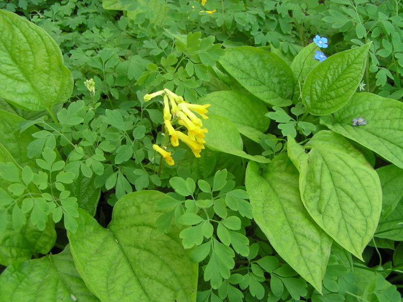Omphalodes verna a Waldsteinia ternata v pokryvné výsadbě brzy na jaře.