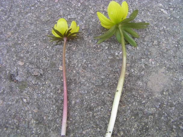 - s Eranthis cilicica (listeny pod květem cca o 1/2 užší), květná lodyha načervenalá, květ drobnější, o cca 2-3 týdny ranější)