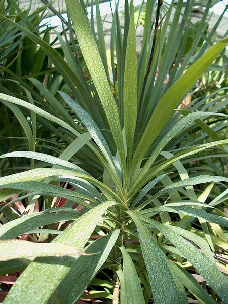 spirálovitě řazené, přisedlé, 30-60 x 1,5-2,5 cm velké; kopinaté až mečovité, s drsným okrajem, nenápadně zoubkované, zužující se směrem k bázi, kožovité, matně zelené, na rubu nafialovělé; porůstají kmínky po celé délce