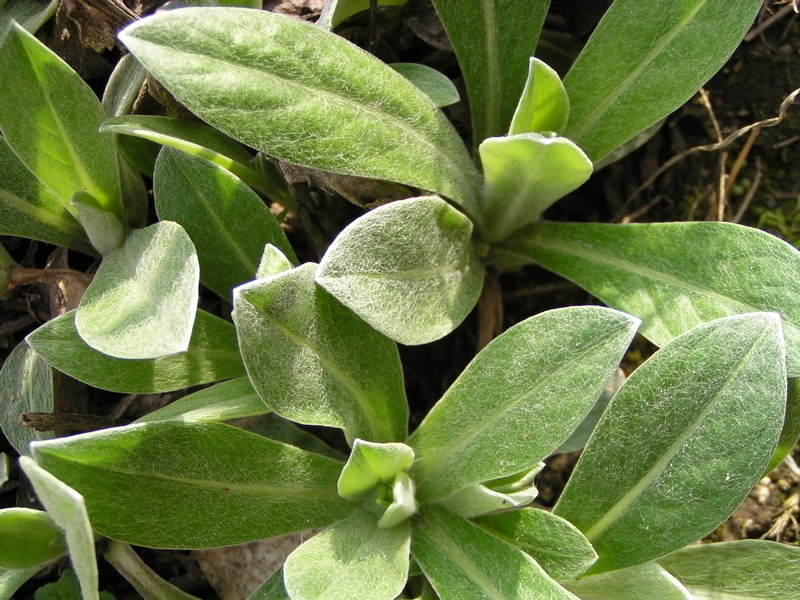 - střídavé, přisedlé až krátce řapíkaté, horní lodyžní listy krátce sbíhavé, čepel kopinatá až eliptická, 8–15 cm dlouhá a 2,5–5 cm široká, celokrajná, plstnatě chlupatá.