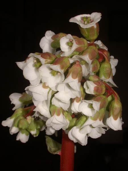 - odrůdy se vzhledem blíží jednomu či druhému z rodičovských druhů: liší se od B. crassifolia latami často žláznatými s květy více poniklými a zvonkovitě staženými, od B. purpurascens širšími, téměř okrouhlými listy a početnějšími květy