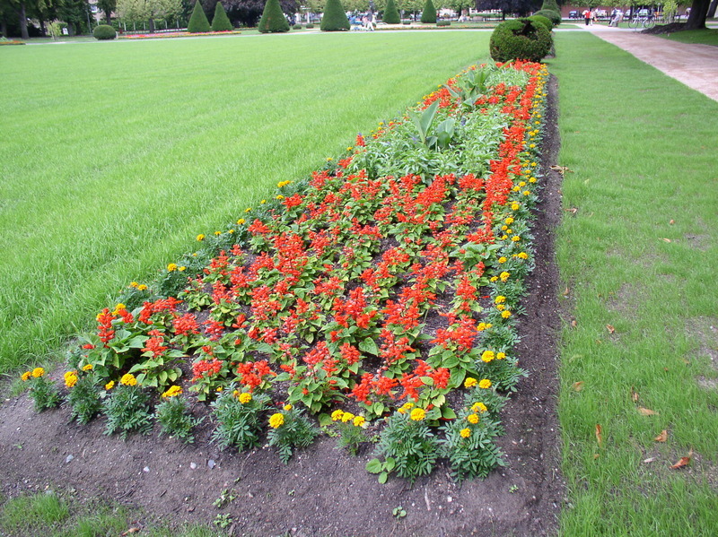 Salvia splendens v čisté sytě červené barvě na záhonu.