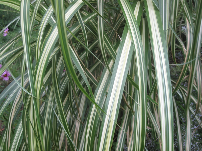 - široké 3 - 3,5 cm, cca 70 cm dlouhé, v horní polovině elegantně obloukovitě ohnuté se silnou středovou krémově bílou variegací a zeleným okrajem listu