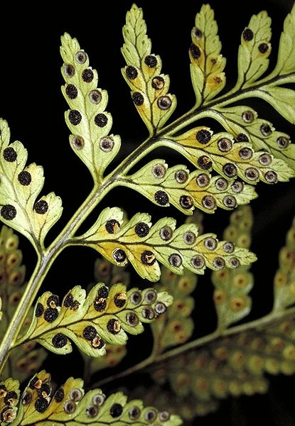 výtrusnicové kupky v průměru až 3 mm, ve dvou řadách mezi střední žilkou a okrajem čepele