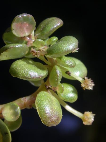 - stěsnaně nahloučené, velmi drobné, lysé, vstřícné ale v páru nestejné: větší obvejčitý zhruba třikrát delší nežokrouhlý lístek protistojný