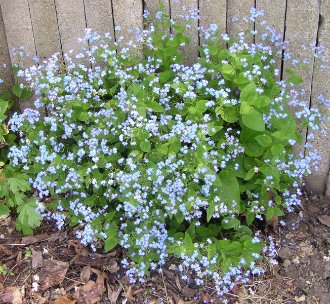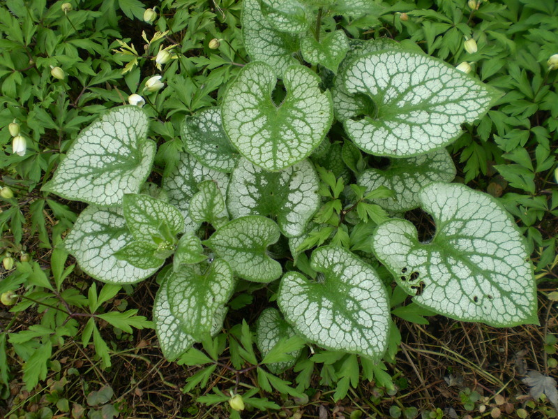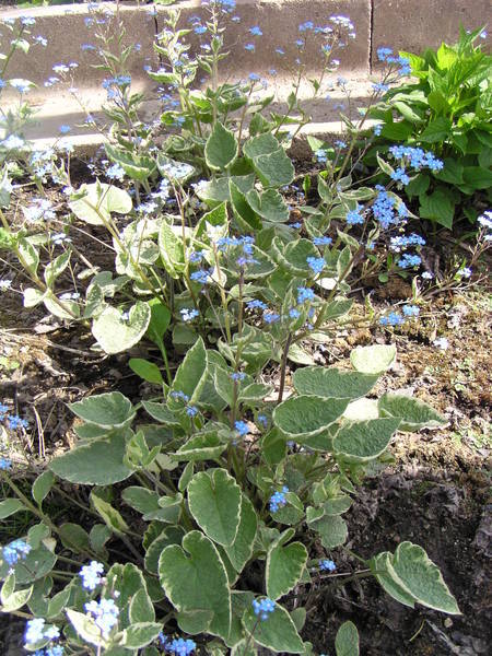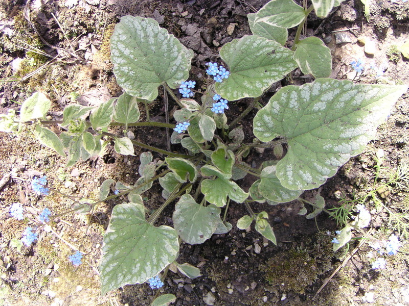 - v květu s Omphalodes verna, rozdíl v habitu rostliny, tvaru a velikosti listu