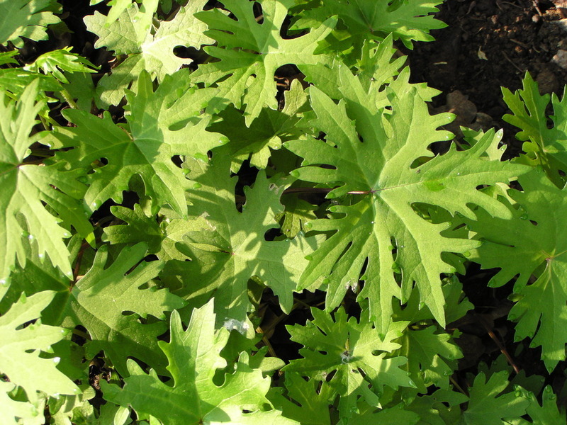 - přízemní listy dlouze řapíkaté (50 cm) 4.5-10 × 8-18 cm velké, hluboce dlanitě 4 - 7 laločnaté, laloky nepravidelně 3 laločnaté až ostře zubaté, výrazně zašpičatělé. Čepel na lící tmavě zelená, na rubu světlejší.