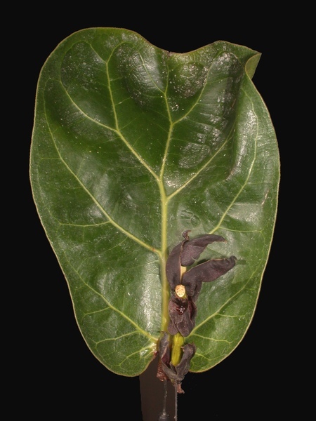 - lyrovité se srdčitou bází, až 0.5 m dlouhé, na vrcholu oblé nebo mělce vykrojené a zkráceně tupě hrotnaté, kožovitě tuhé a oboustranně lysé, vespod s hrubě vyniklou nervaturou, se silnými řapíky a zvlněnými okraji; palisty nápadné, hnědopurpurové, neopadavé