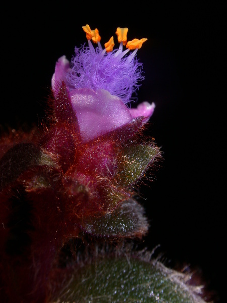 drobné, oboupohlavné, aktinomorfní, různoobalné, volnoplátečné, trojčetné, temně purpurové, diplostemonické s nápadně chlupatými tyčinkami a žlutými prašníky