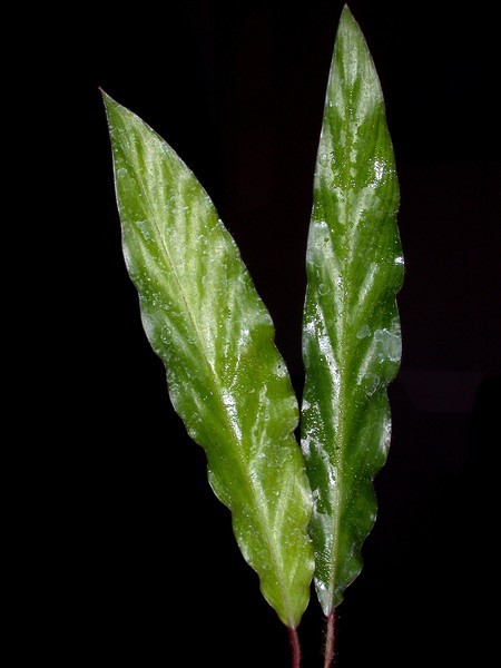 - homotropní, dlouze řapíkaté (poměr délky řapíku k čepeli proměnlivý v ontogenezi), hrotnaté, úzce kopinaté, zvlněné, asymetrické čepele až 0.3 m dlouhé, shora temně zelené, vespod purpurové, červenavě pýřité