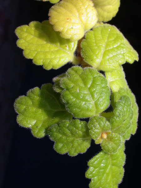 - řapíkaté, široce vejčité s hrubě vroubkovanými okraji, shora roztroušeně pýřité a žláznaté, vespod plstnatě oděné