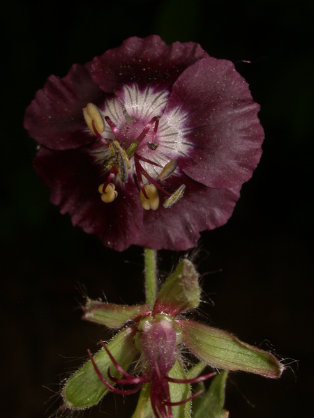 - nepříliš veliké, různoobalné, oboupohlavné, volnoplátečné, pětičetné, hnědopurpurové s bělavým okem nebo (var. lividum) šeříkově růžové, slabě souměrné s plátky překrývajícími se a nazpět ohnutými, se žlutými nebo fialovými prašníky; sepaly osinkaté a žláznatě chlupaté