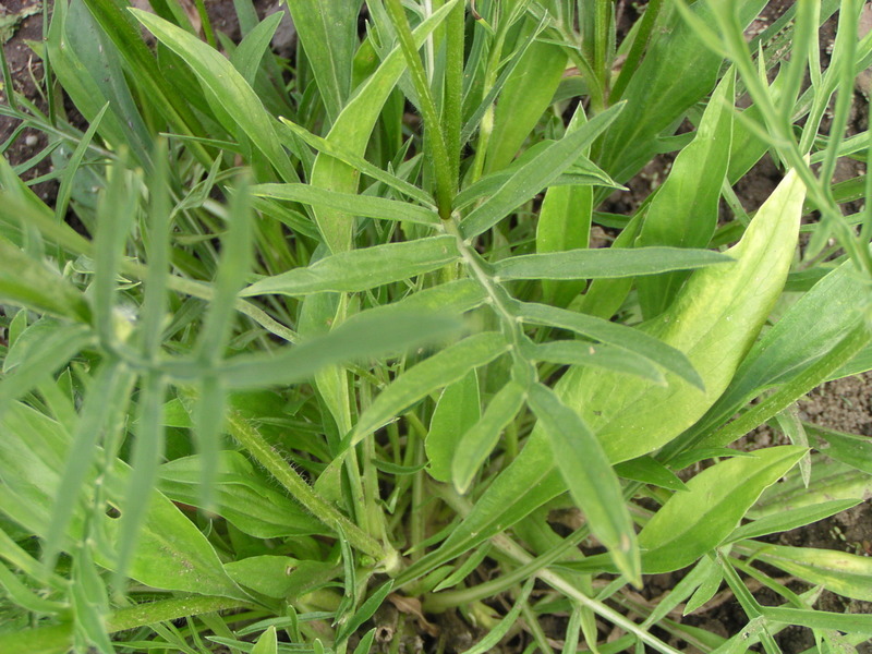 - variabilní, přízemní a dolní lodyžní listy jsou jednoduché, celokrajné, kopinaté, vstřícné, horní lodyžní listy jsou na bázi srostlé, někdy peřenosečné, úkrojky čárkovité, mírně našedlé