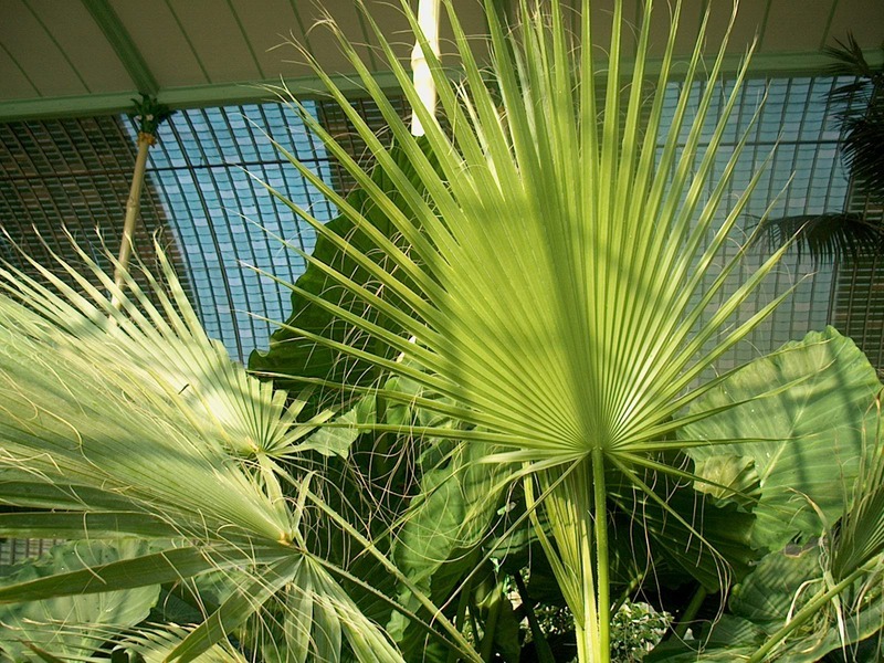 - Washingtonia robusta H. Wendl. - světle zelená listová čepel, úkrojky bez vláken, řapíky pilovité