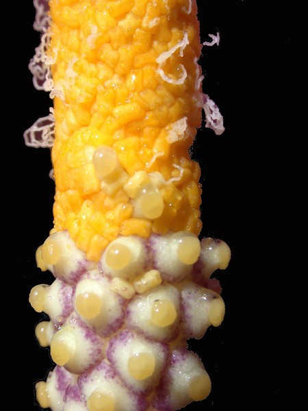- různopohlavné, bezobalné, samičí krémové s purpurovými bázemi a zelenými bliznami, samčí žluté, stěsnané v synandriích