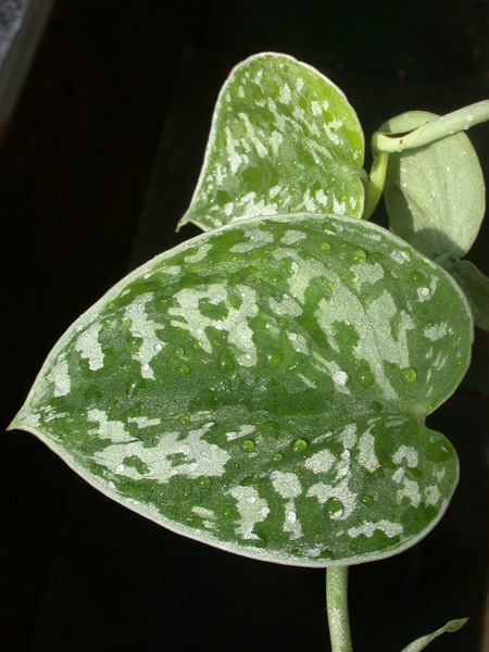 - pochvatě řapíkaté, asymetricky hrotnatě vejčité, stěží 0.1 m dlouhé, lysé a hedvábně lesklé, temně sivozelené s stříbřitými skvrnami v podélných pásech