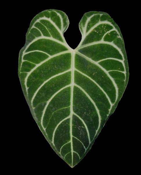 - pochvatě a kloubnatě řapíkaté (řapíky oblé!), až 0.4 m dlouhé, vejčitě srdčité s překrývajícími se laloky, temně zelené a sametově lesklé (drobné papilly) s bělavými pásy sledujícími stejně zbarvenou nervaturu