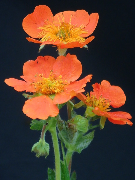 - oboupohlavné, různoobalné, pravidelně pětičetné, s trojúhlými, po rozkvětu nazpět skloněnými, pýřitými sepaly střídanými s drobnými lístky kalíšků, koruny rozevřené, zhruba 3 cm široké s petaly mělce obsrdčitými a rumělkově červenými, tyčinky se žlutými prašníky jsou početné, podobně i pestíky s čnělkami prodlužujícími se po odkvětu