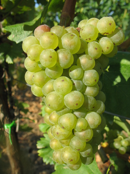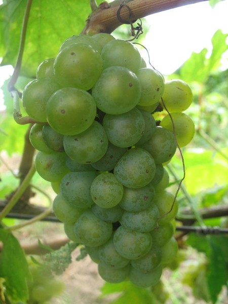 - malý až středně velký kuželovitě-válcovitý hrozen, hustší, kompaktní; bobule kulatá, středně velká, žlutozelená; na vrcholu bobule je černá tečka po blizně
