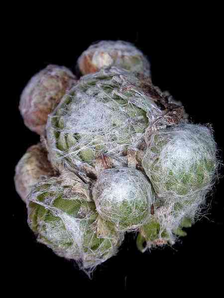 - spirálně sestavené v husté růžici, hrotnatě obkopinaté, masité, žláznaté s chomáčky bílých kadeřavých chlupů pavučinkovitě splétaných s chlupy jiných listů