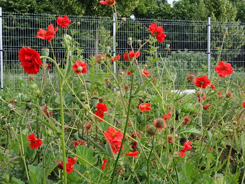 - oboupohlavné, různoobalné, pravidelně pětičetné, s trojúhlými, po rozkvětu nazpět skloněnými, pýřitými sepaly střídanými s drobnými lístky kalíšků, koruny rozevřené, zhruba 5 cm široké se zvlněnými, srdčitě vykrojenými, rumělkově červenými (u odrůd i rubínovými nebo žlutými a často pomnoženými) petaly, tyčinky se žlutými prašníky jsou početné, podobně i pestíky s čnělkami prodlužujícími se po odkvětu
