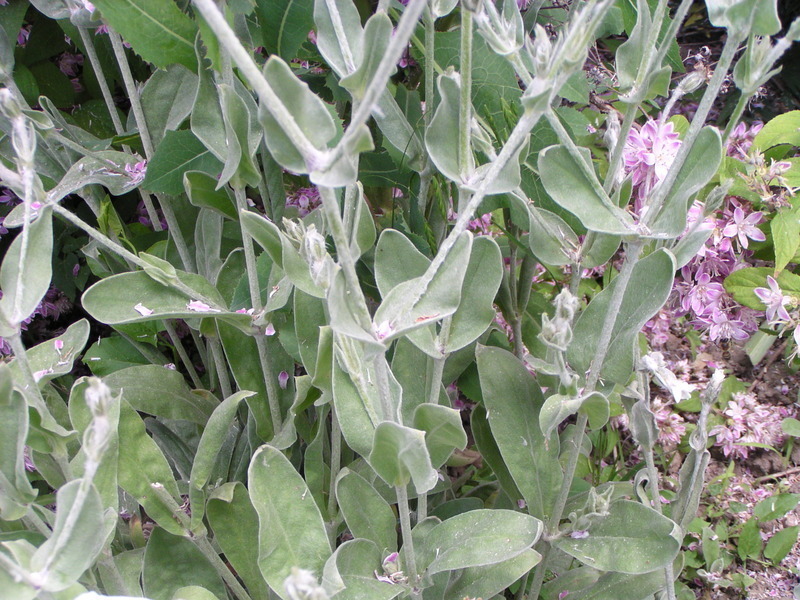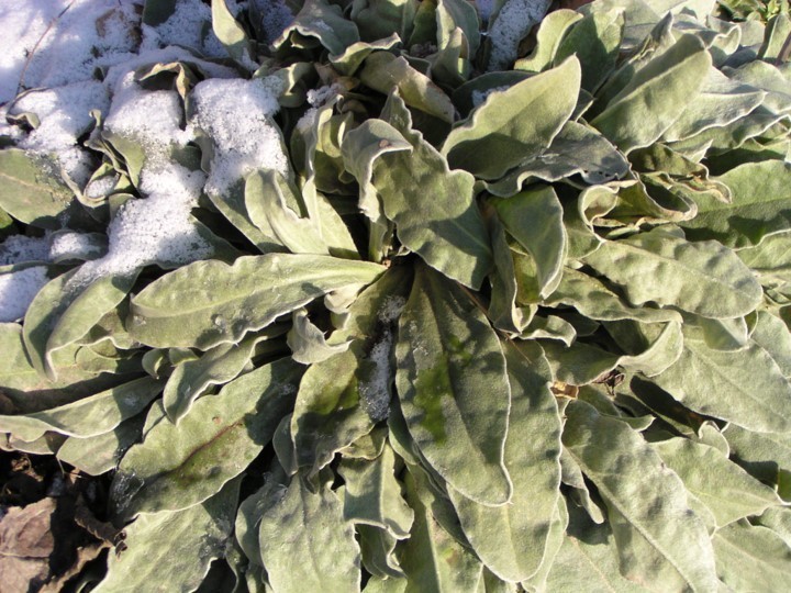 - přízemní listy v růžici eliptické až podlouhle kopinaté, mírně zvlněné, cca 10-20 cm x 3-4 cm; lodyžní listy přisedlé, vstřícné, na bázi srostlé, kopinaté. Listy i lodyha stříbřitě jemně ale hustě pýřitá