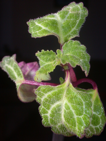 - řapíkaté, vejčitě okrouhlé s mělce vroubkovanými okraji, polodužnaté, štětinatě pýřité, shora zelené s popelavě bílou kresbou při nervatuře, vespod purpurové