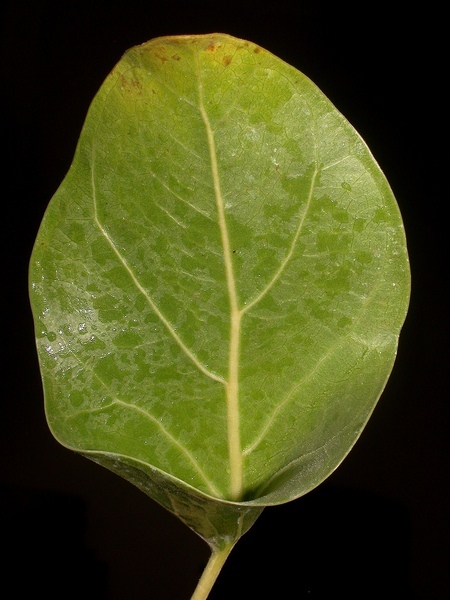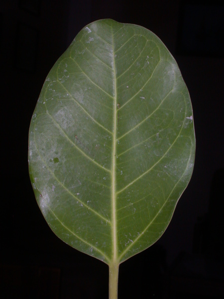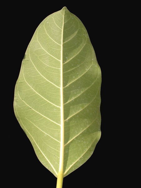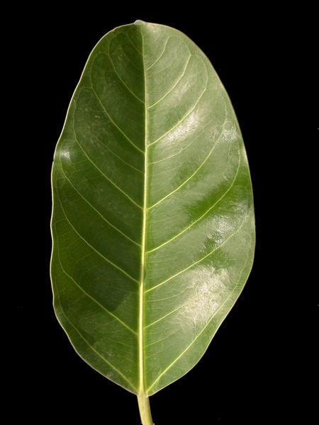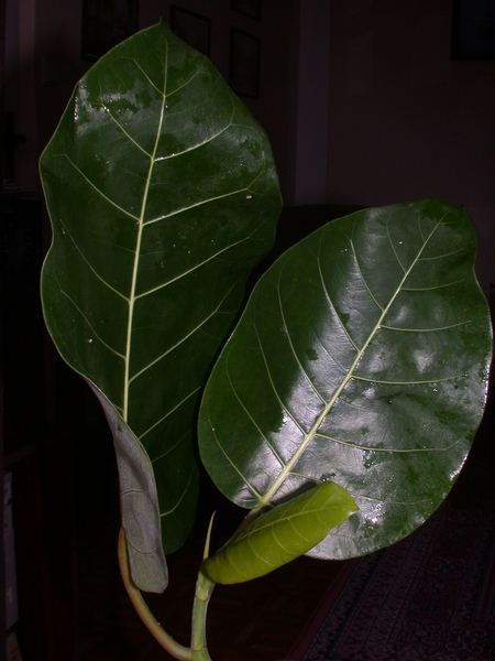 - Vejčitě elipčité, až 0.3 m dlouhé se silnými řapíky; temně zelené, oboustranně lysé s výraznou, bledou, bělavě chloupkatou primární nervaturou (vybíhající z žebra nanejvýš v šesti párech), kožovité, s bazálními voskodárnými žlázkami; palisty pýřité, opadavé