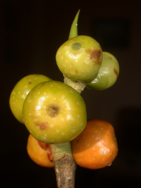 - drobná, přisedlá, globosní receptakula uzavírající květy (fíky), párovaná, s nevyniklými ostiolami, lysá, po uzrání žlutá, růžová nebo purpurová a bělavě tečkovaná