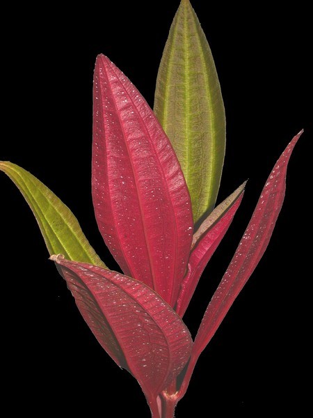vstřícné, v páru podobné, elipčitě kopinaté, až 0.2 m dlouhé, třínervé, nepravidelně drobně vroubkované, lysé, vespod purpurové s cystolity tvaru V; palisty nápadné, blanité, opadavé