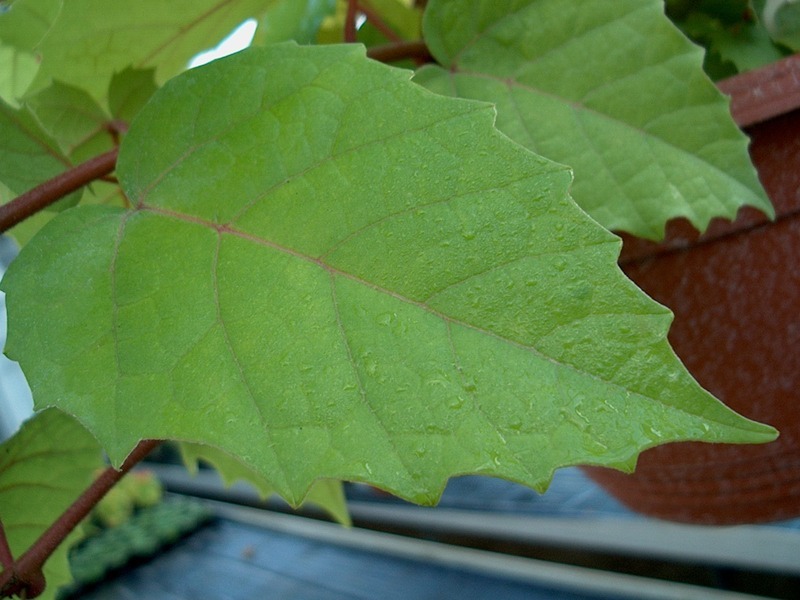 - střídavé; vejčité nebo podlouhlé, 7-10 x 4-7 cm dlouhé, se srdčitou bází; lysé, pravidelně hrubě pilovité až celokrajné, zelené, lesklé; narůžovělé řapíky