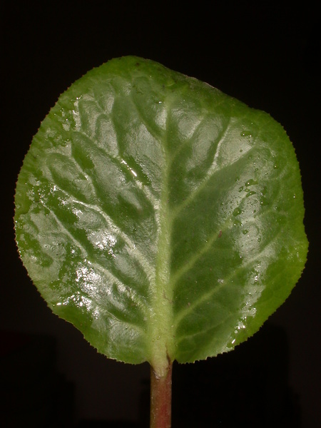 - obvejčitě okrouhlé (často se srdčitými bázemi), masitě kožovité, lysé, často hodně přes 0.1 m široké, se zvlněně zoubkatými okraji, v zimě často purpurové, řapíky silné a pochvaté