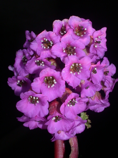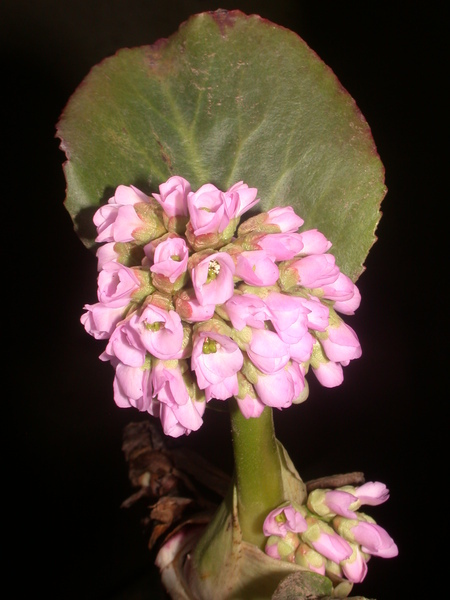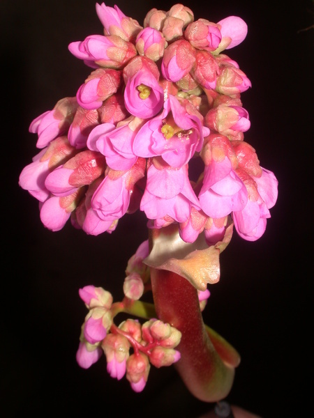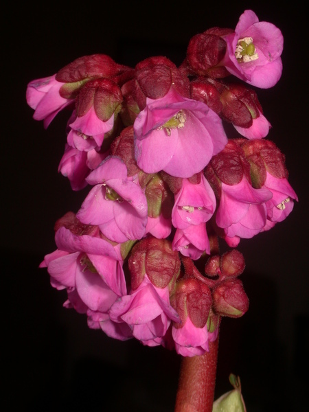 - řada odrůd s květy temně purpurovými (´Purpurea´, ´Rotblum´, ´Eroica´, ´Winterglöd´, ´Purpurglocken´), křížením var. crassifolia a var. cordifolia povstaly též odrůdy s květy sytě růžovými (´Profusion´, ´Sunshine´, ´Wintermärchen´, ´Herbstblüte´, ´Frühlingsfreude´) nebo bělorůžovými (´Silberlicht´, ´Schneekönigin´). Nelze vyloučit, že některé z odrůd sem řazených jsou hybridy s blízkou B. purpurascens (B. x smithii)