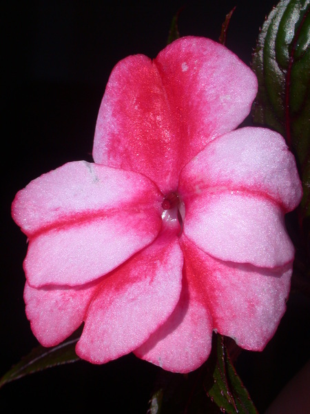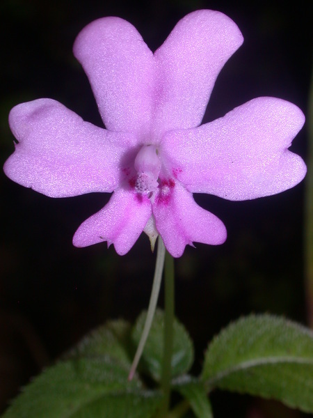 - oboupohlavné, souměrné, velikosti dětské dlaně s pěti rozměrnými, srdčitě vykrojenými, ploše seskládanými petaly a dlouhou tenkou ostruhou, v šarlatových, purpurových, růžových a bílých odstínech