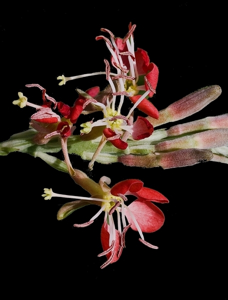 - početné, neveliké, zygomorfní, různoobalné, čtyřčetné, diplostemonní s čtyřlaločnými bliznami, bílé nebo růžové, často s červenými kalichy