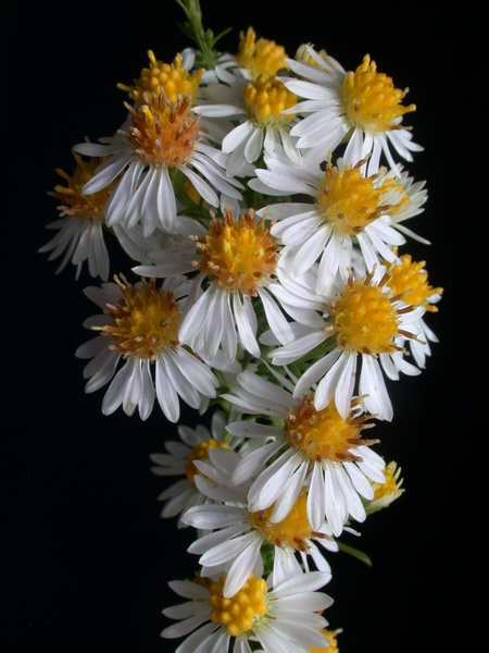 - drobné a početné, v rozkladitých pyramidálních latách seskládané úbory s nestejnými, hrotitými zákrovními listeny ve 3-4 řadách, s 8-16 paprsky a 8-16 (zřídka více) krémovými kvítky disku