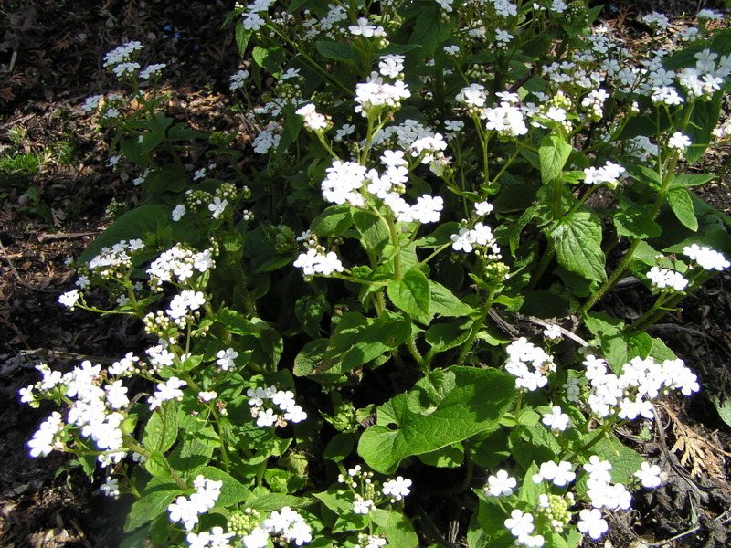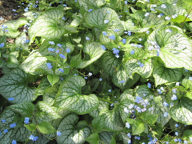 - v květu s Omphalodes verna, rozdíl v habitu rostliny, tvaru a velikosti listu