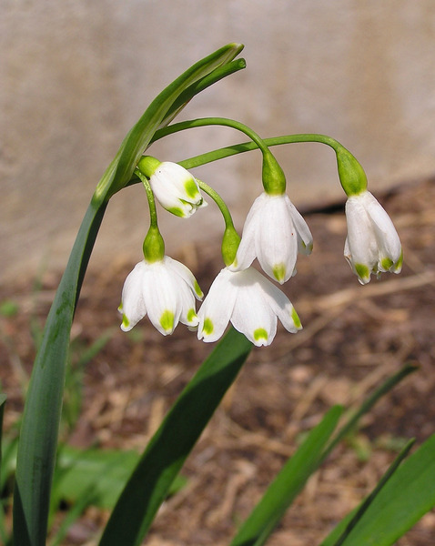 - Z drobné vejčité cibule bílé barvy, kryté slabou tmavou slupkou, vyrůstají podlouhlé žlábkovitě prohnuté listy a květní stvol nesoucí 1-7 květů zvonkovitého tvaru visících dolů, které jsou před rozkvětem chráněny blanitým listenem. Květy jsou složeny ze šesti plátků bílé barvy se zelenavou skvrnou nad špičkou. Plodem je kulovitá tobolka. Požití částí rostliny, především cibulek, způsobuje otravy projevující se sliněním, zvracením, průjmem, poruchami vědomí a celkovou slabostí.